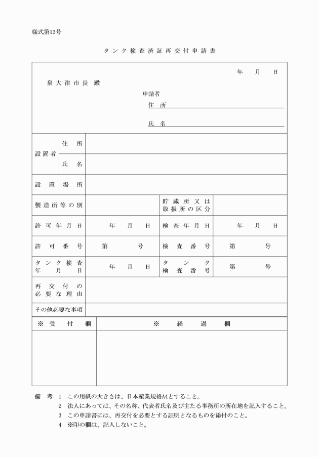 第9条 政令第8条の2第7項の規定によるタンク検査済証の交付を受けた者が、タンク検査済証を亡失し、滅失し、汚損し、又は破損した場合において、再交付を受けようとするときは、タンク検査済証再交付申請書(様式第13号)2部を市長に提出しなければならない。