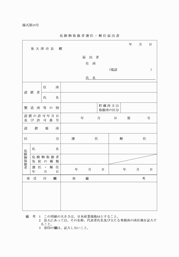 第12条 製造所等(法第13条第1項に規定する製造所等を除く。)において危険物を取り扱う場合は、法第13条の2に規定する危険物取扱者免状の交付を受けている者のうちから危険物取扱者を選任し、遅滞なく危険物取扱者選任・解任届出書(様式第14号)2部を市長に提出しなければならない。これを解任したときも同様とする。