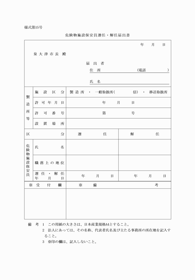 第13条 製造所等の所有者、管理者又は占有者(以下「関係者」という。)は、法第14条の規定により危険物施設保安員を定めた場合は、遅滞なく危険物施設保安員選任・解任届出書(様式第15号)2部を市長に提出しなければならない。これを解任した場合も同様とする。