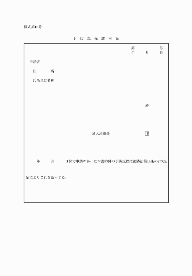 第14条 市長は、法第14条の2第1項の規定による予防規程の制定又は変更の申請があった場合において、当該申請を受けた事項について認可を行う場合は、予防規程認可証(様式第16号)を申請者に交付するものとする。