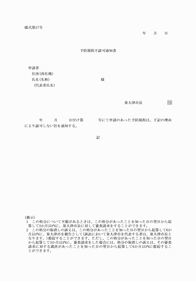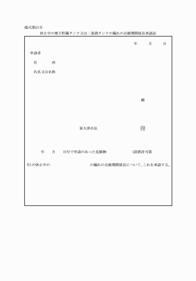 第17条 市長は、府令第62条の5の2第2項ただし書の申請を受けた事項について承認をする場合は、休止中の地下貯蔵タンク又は二重殻タンクの漏れの点検期間延長承認証(様式第21号)を申請者に交付するものとする。