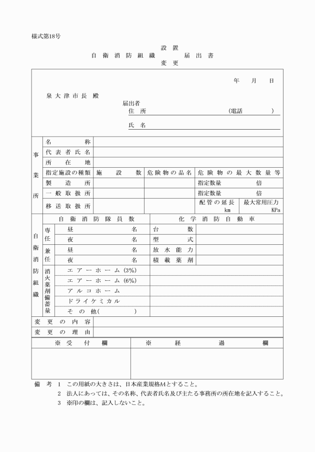 第15条 関係者は、法第14条の4の規定により自衛消防組織を設置し、又はその組織を変更した場合は、遅滞なく自衛消防組織設置・変更届出書(様式第18号)2部を市長に提出しなければならない。