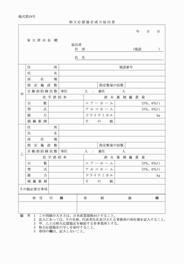 2 関係者は、政令第38条の2ただし書に規定する相互応援協定を締結した場合は、遅滞なく相互応援協定成立届出書(様式第19号)2部を市長に提出しなければならない。