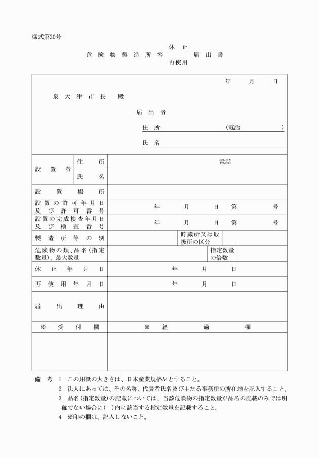 第16条 関係者は、製造所等の使用を1か月以上休止し、又は休止後その使用を再開しようとする場合は、危険物製造所等休止・再使用届出書(様式第20号)2部を市長に提出しなければならない。