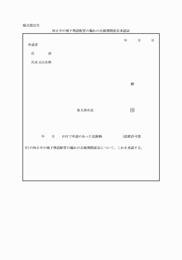 第18条 市長は、府令第62条の5の3第2項ただし書の申請を受けた事項について承認をする場合は、休止中の地下埋設配管の漏れの点検期間延長承認証(様式第22号)を申請者に交付するものとする。