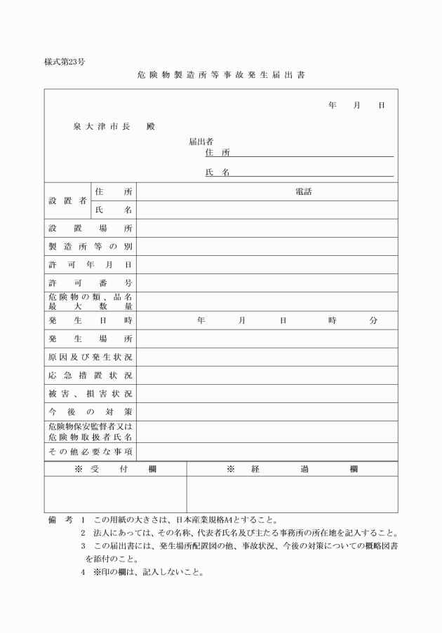 第19条 関係者は、法第16条の3第1項の規定による事故が発生した場合は、速やかに危険物製造所等事故発生届出書(様式第23号)2部を市長に提出しなければならない。