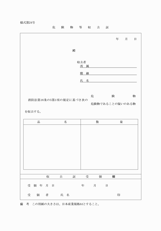 第20条 法第16条の5第1項の規定により危険物又は危険物であることの疑いのある物を収去しようとする場合は、関係者に危険物等収去証(様式第24号)を交付して行わなければならない。