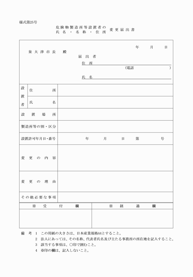 第21条 関係者は、政令第6条第1項第1号の事項を変更した場合は、遅滞なく危険物製造所等設置者の氏名・名称・住所変更届出書(様式第25号)2部を市長に提出しなければならない。