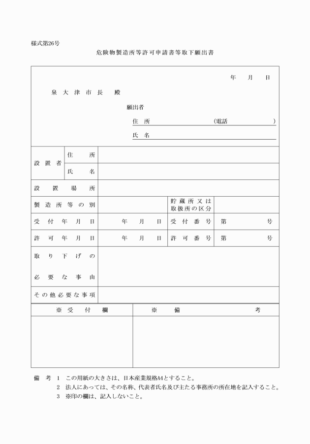 第22条 関係者は、製造所等の許可及びこれらに係る申請等を取り下げようとする場合は、危険物製造所等許可申請書等取下願出書(様式第26号)2部を市長に提出しなければならない。