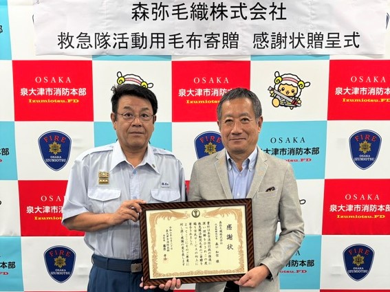 消防本部は、令和7年7月30日(水曜日)森弥毛織株式会社(寿町)代表取締役社長 森口様に、救急隊活動用毛布の寄贈に対する感謝状を贈呈しました。