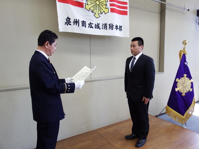 その功績が称えられ、令和2年3月24日泉州南広域消防本部より感謝状及び記念品を贈呈されました。