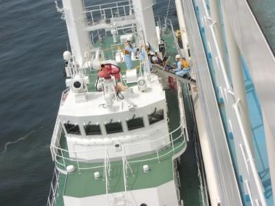 海上保安庁が巡視船みのおに傷病者を収容している風景