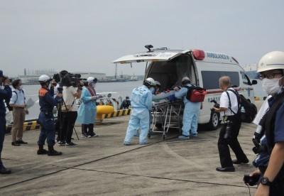 岸壁に待機していた救急隊が傷病者を引継ぎ救急車内に収容