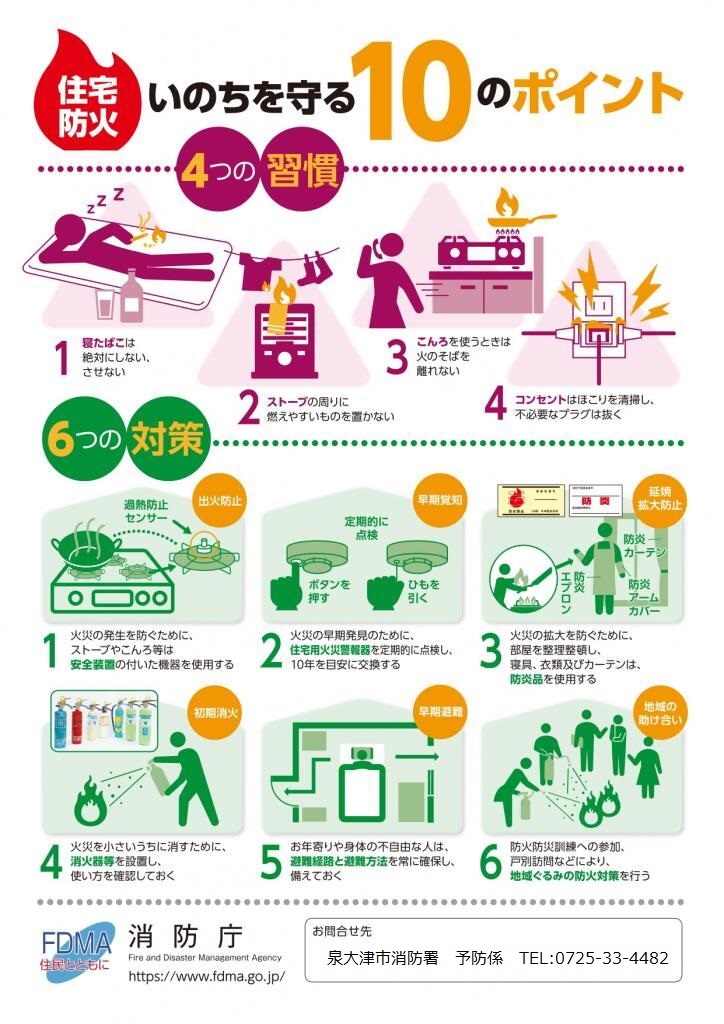 平成12年に作成された「住宅防火 いのちを守る 7つのポイント」が改正されました。作成当時と比べ住宅火災を取り巻く状況も変化していることから、新たに「住宅防火 いのちを守る 10のポイント」が作成されました。以下の「4つの習慣」「6つの対策」を参考に、各ご家庭での住宅防火にご協力をお願いいたします。